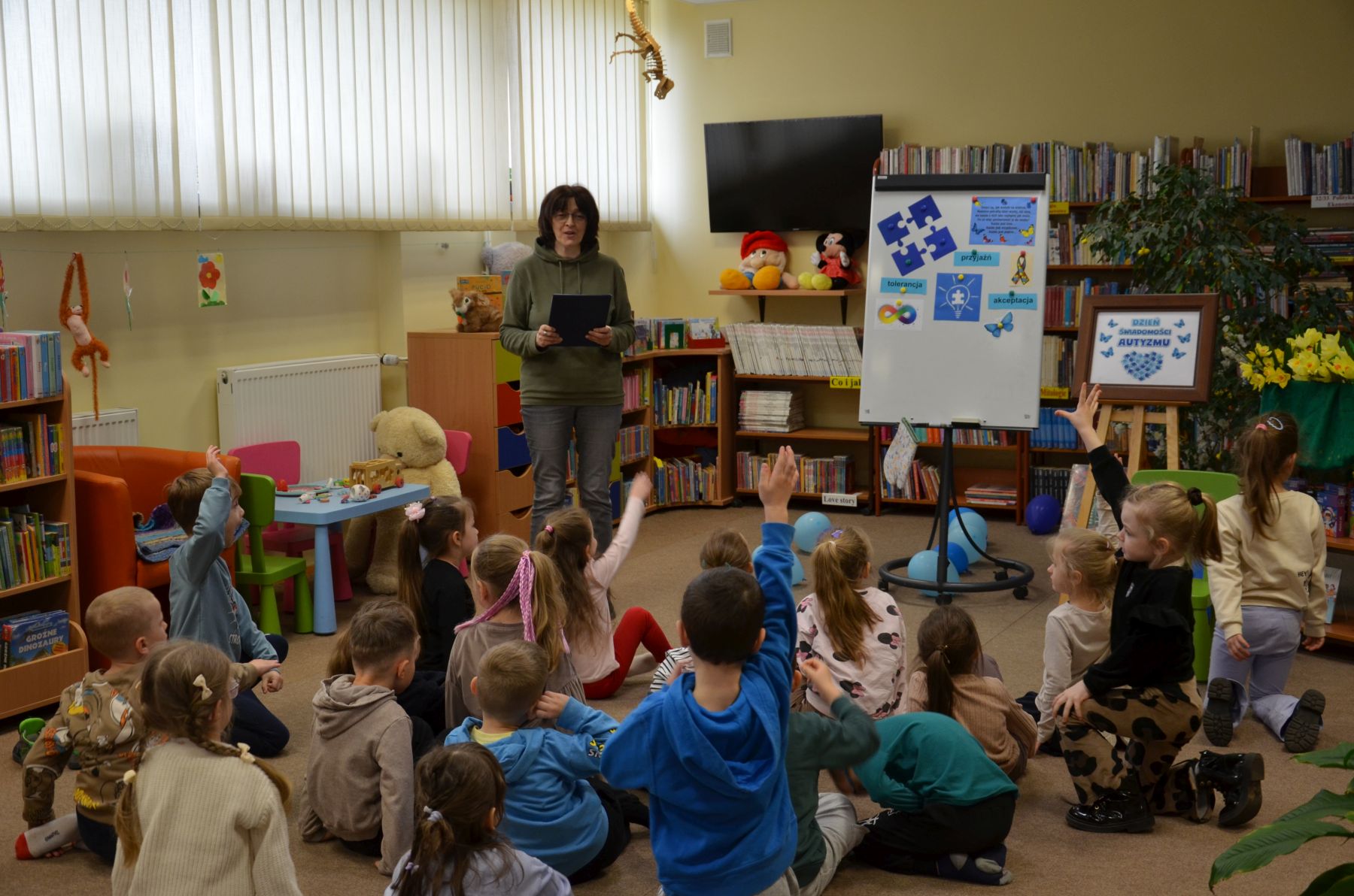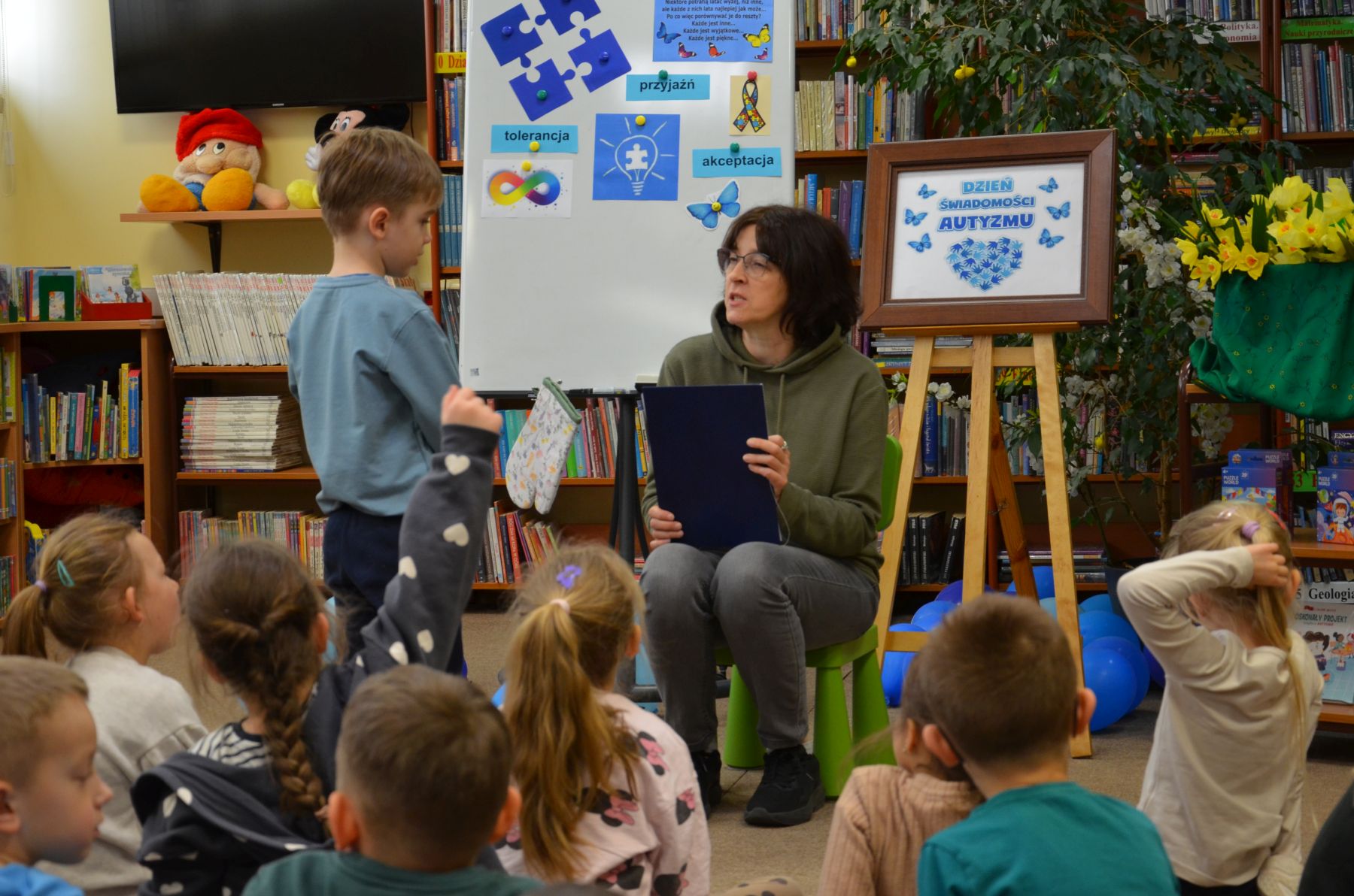 Przedszkolakom przeczytaliśmy książkę Magdaleny Grucy pt. „Porządek musi być”, w ktorej autorka stara się przekazać w jak najprostszy sposób, jak postrzegany jest świat osób w spektrum. Tak jak my wszyscy jesteśmy różni, tak różne są przypadki autyzmu i to jest właśnie piękne, bo możemy wymieniać się osobistymi odczuciami i przeżyciami.