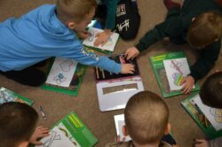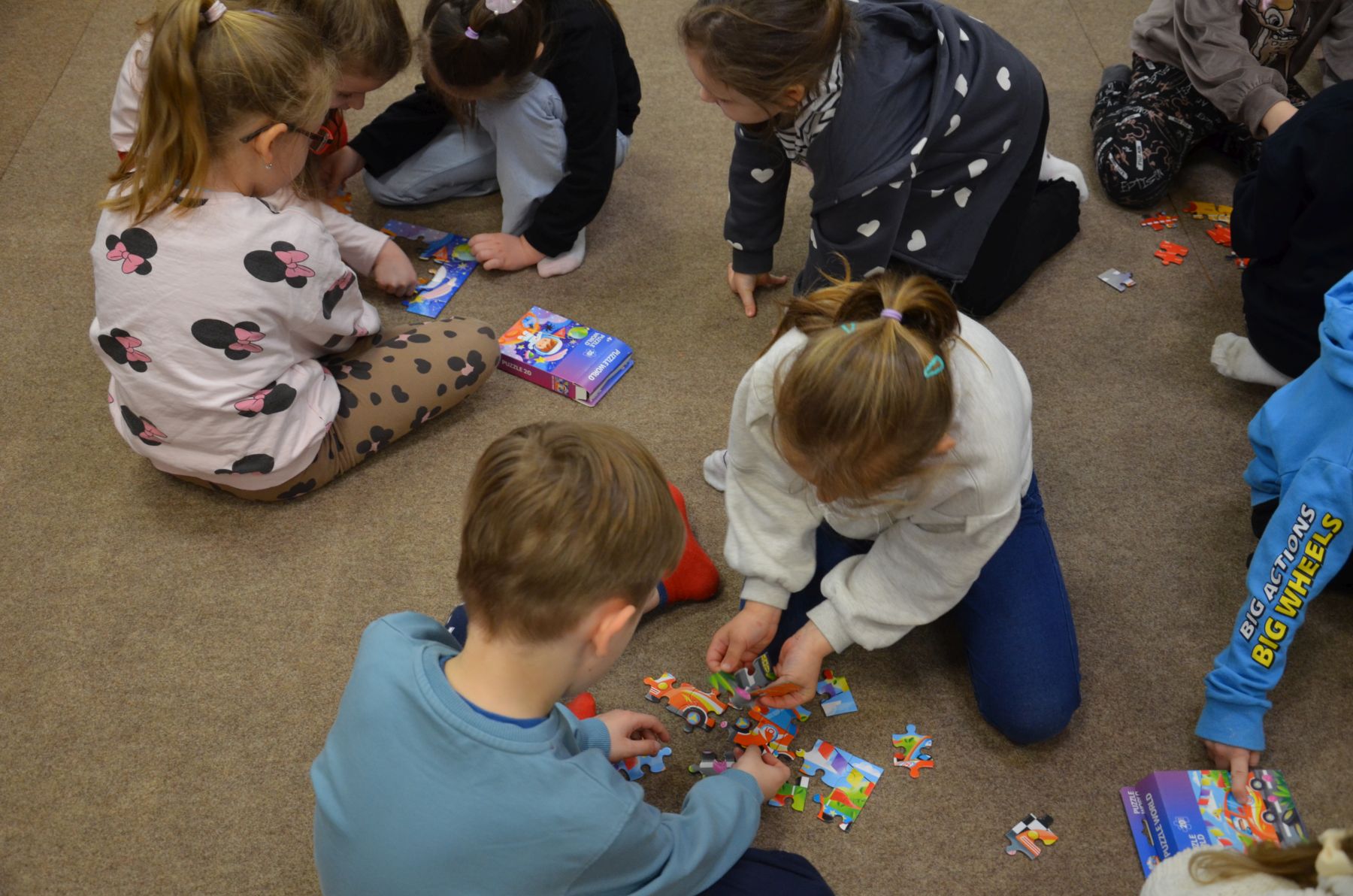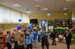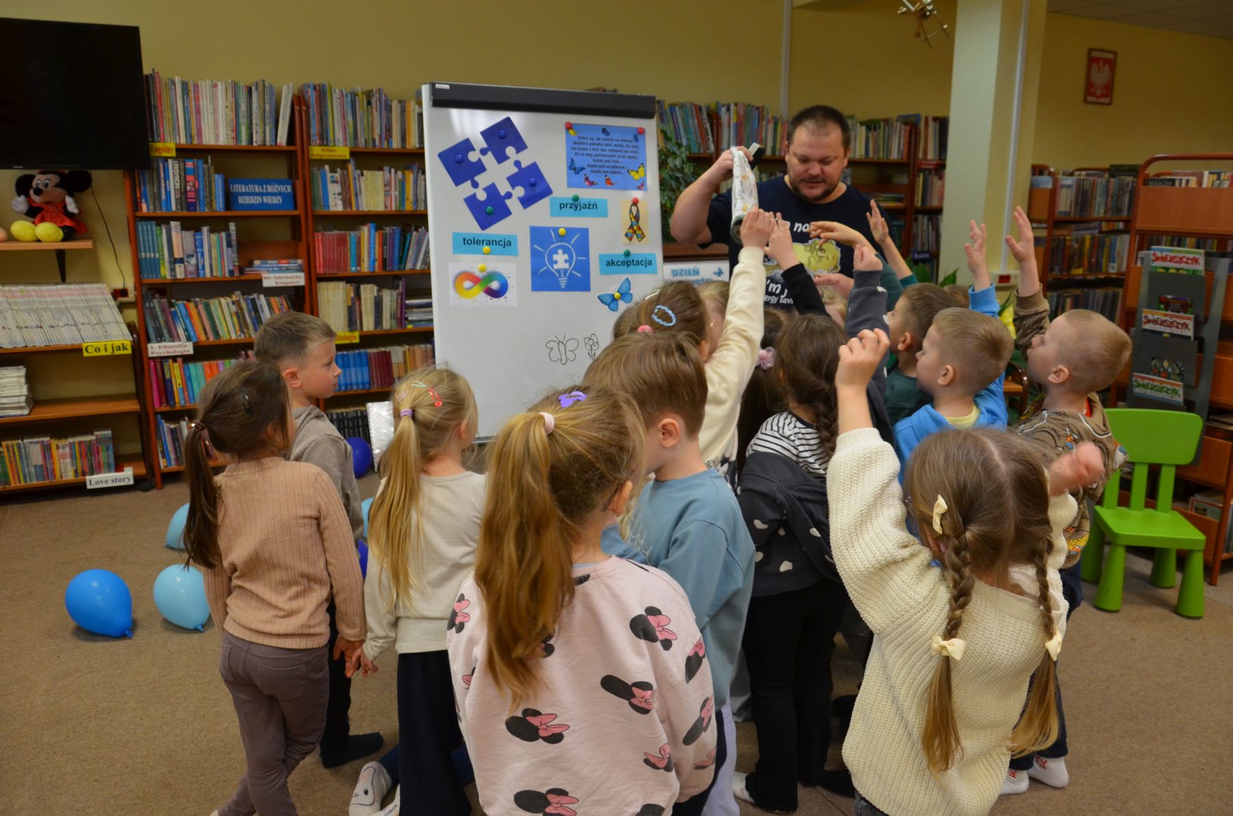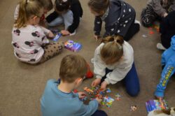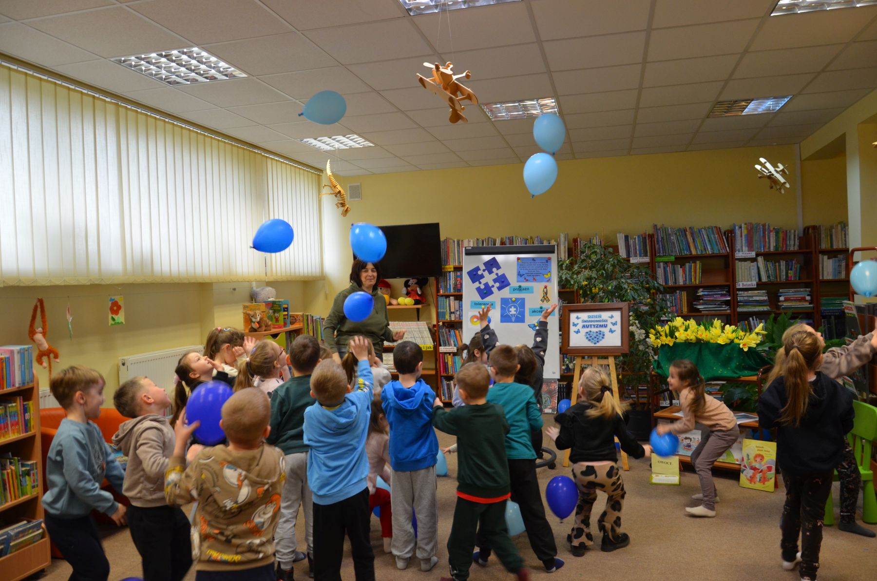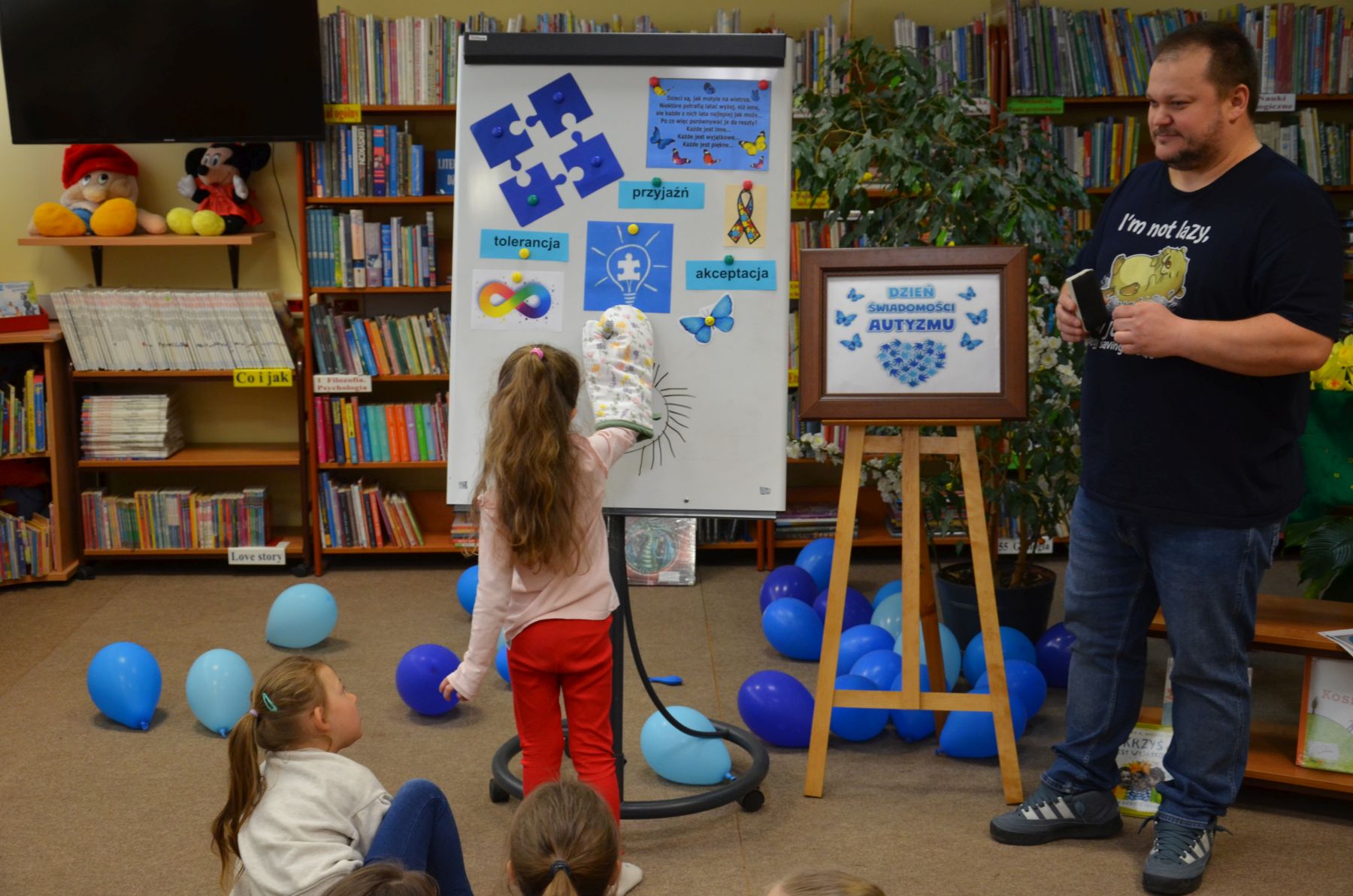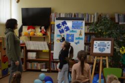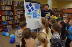 Dzieci chętnie uczestniczyły w zabawach, które przybliżały im jak mogą widzieć i czuć otaczający nas świat osoby z autyzmem. Kolorem świadomości autyzmu jest niebieski, dlatego też na wyraz wspólnoty i jedności, wszyscy uczestnicy otrzymali do zabawy baloniki w tym kolorze. Symbolami autyzmu są m.in.puzzle, chętnie układane przez uczestników oraz motyle, które były kolorowane nie tylko na kolor niebieski.